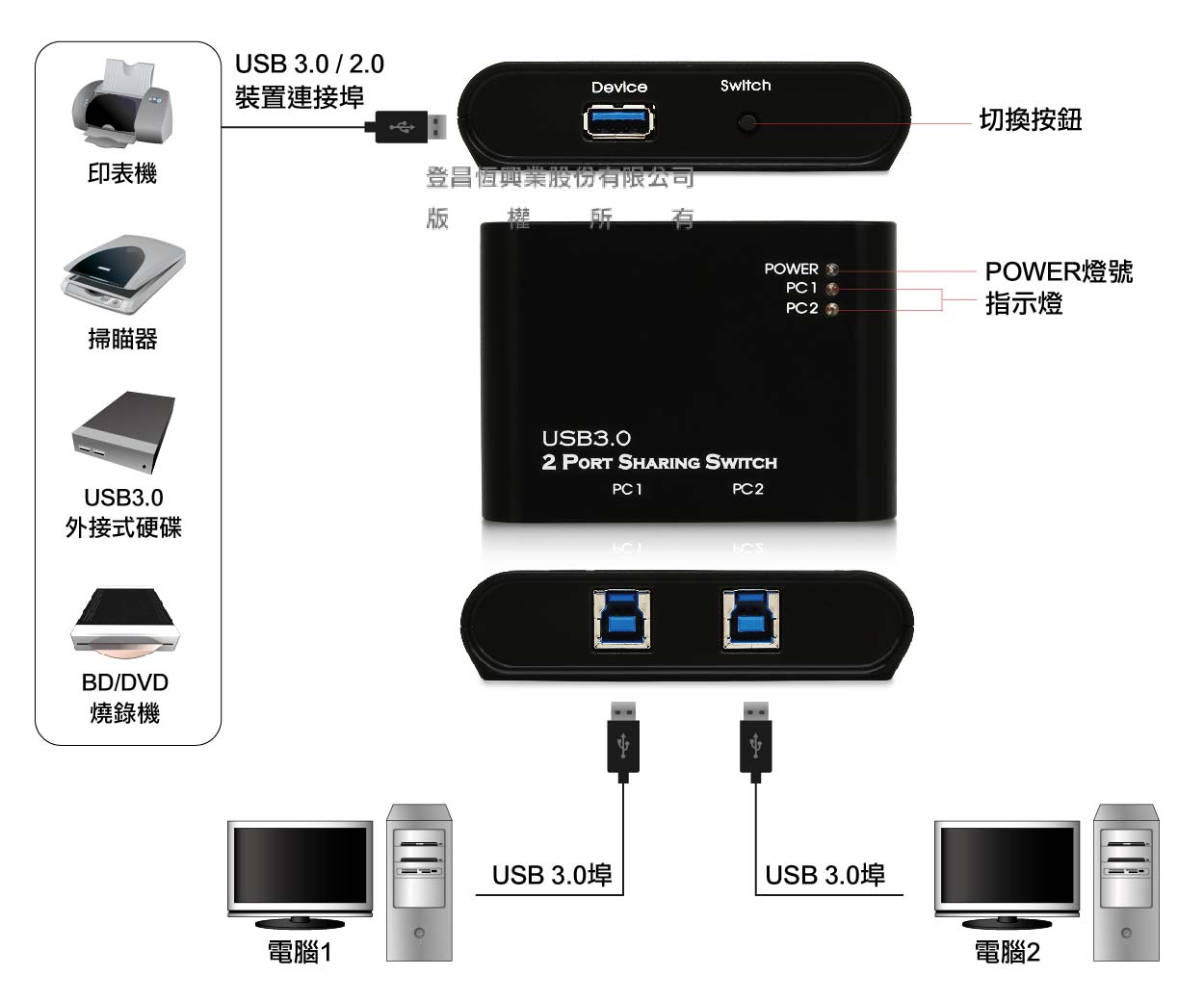 US220是一款USB 3.0手动切换器,可让二部计算机共享一组USB 3.0装置,让您不需在计算机间反复插拔USB连接线,且不需连接网络就可以轻松分享USB 3.0外围装置,提供按键切换及键盘热键切换功能,协助提升工作效率。