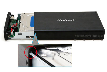 | 3.请将硬盘盒对准两侧卡榫后,装回EHE305外壳。 (请注意EHE305硬盘盒的方向性) |