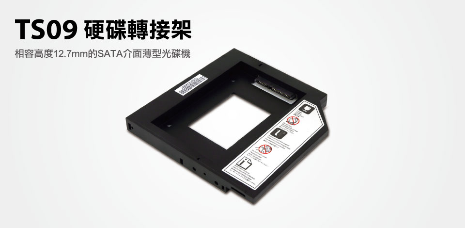 TS09能利用原本笔记型计算机薄型光驱的空间,另外安装一颗2.5吋硬盘或SSD固态硬盘。TS09是笔记型计算机使用者想要增加储存空间或加快运作效能的最佳选择。