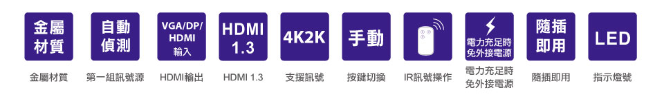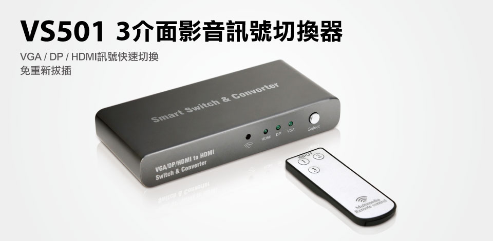 支持VGA+Audio、DisplayPort、HDMI三种不同的影像接口讯号输入,并切换至输出的HDMI讯号。