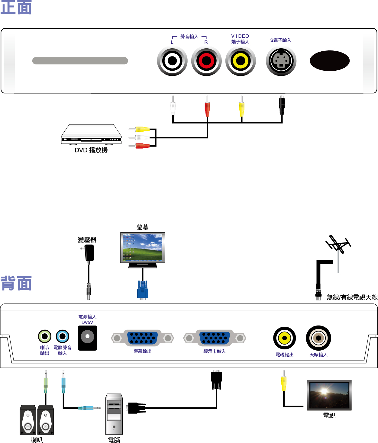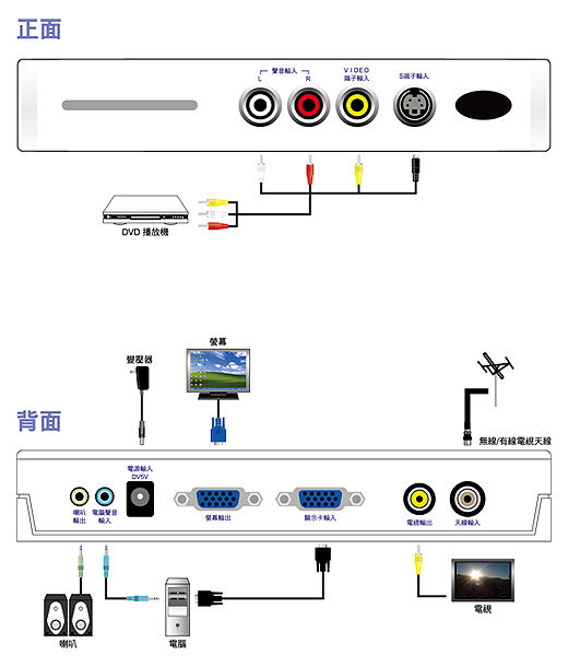 提供电视、CVBS(Video)、S-Video 三组影像输入端子。 |