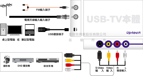 内建1组电视输入、1组FM广播输入、1组Video影像输入、1组S-Video影像输入及1组RCA(立体声)声音输入等多种模拟讯号输入端子。 |