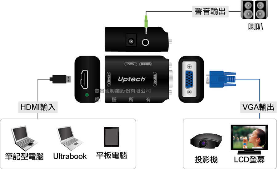 | HC102A可连接笔记型计算机、Ultrabook、平板计算机,或其它具有HDMI输出端子的设备,将HDMI数字讯号转换为VGA端子+立体声输出,轻松的将影音画面显示在屏幕或投影机上。 |