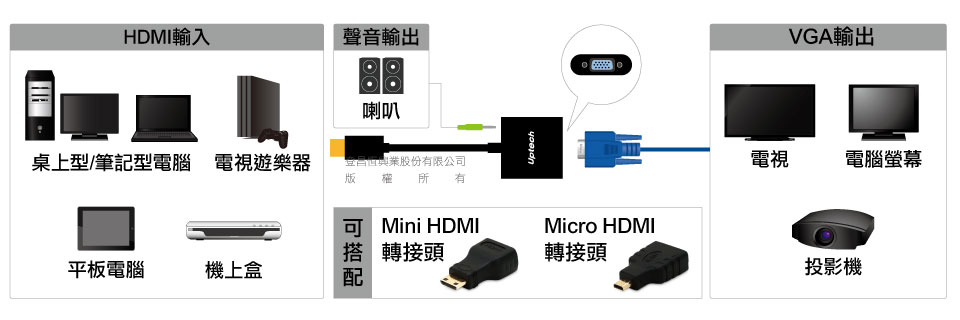可将HDMI数字讯号转换为VGA端子+立体声输出 |