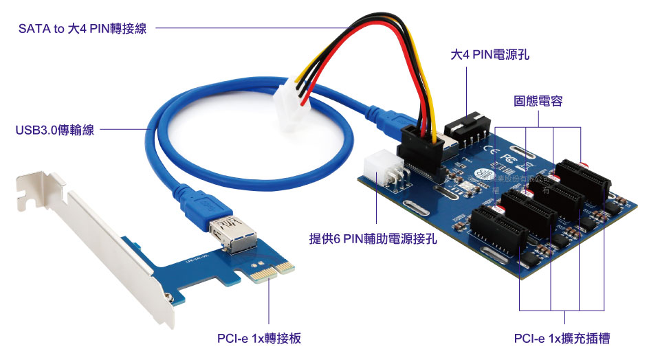 可搭配PCI130将PCI-e 16x的显卡转接成PCI-e 1x,并加倍扩充显示适配器。节省主板的费用,又可善用主板上的孔位,增加多组显示适配器提升挖矿速度。