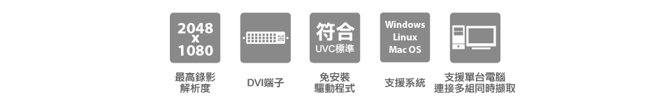 | USB | USB3.0(录像分辨率最高可支持2048×1080 / 1920x1200p@60fps) 兼容USB2.0、USB3.1 Gen1(画面更新率最高可支持60fps、实际更新率可能会受限于USB频宽) ※建议使用USB 3.0,以获取最佳的分辨率画质 |
