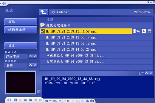 | 22.點主畫面『錄製的電視節目』,可直接做播放、剪接、重新命名、刪除集燒錄光碟的動作。 | ||||