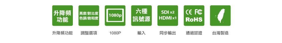 | 支援輸出解析度 | SDI/HDMI 1080p60/50, 1080i60/50, 1080p30/25/24, 720p60/50 1080p59.94, 1080i59.94, 720p59.94, 1080p29.97, 1080p23.98 525i, 625i |