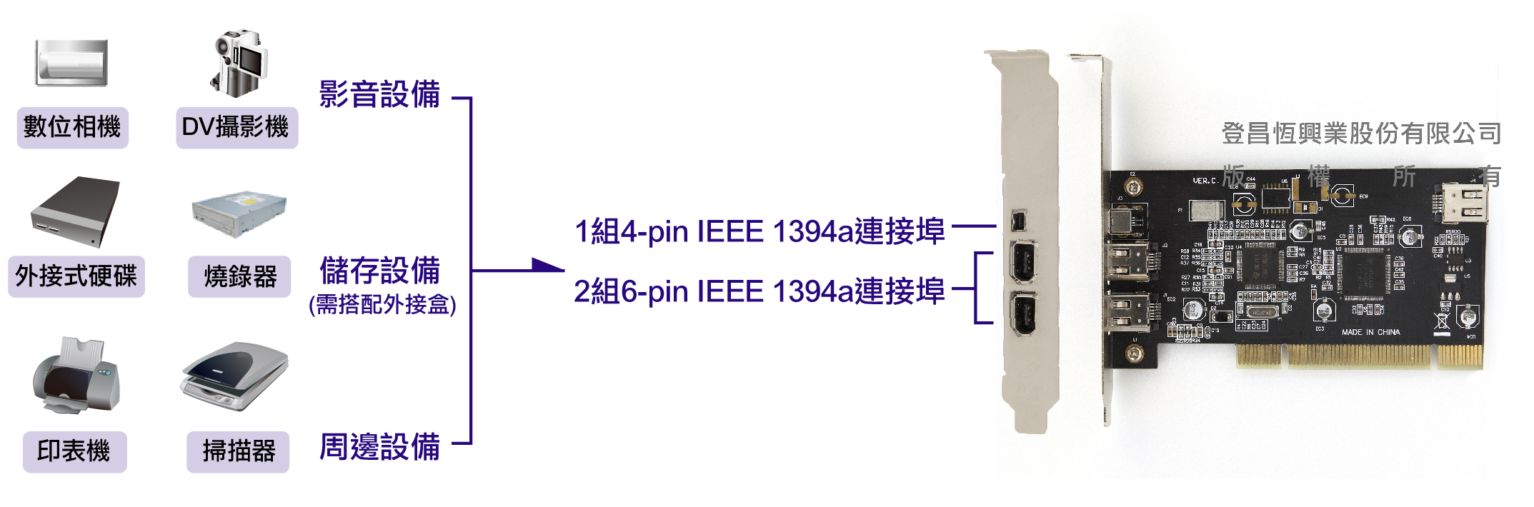 符合IEEE1394-1995及1394a標準通訊協定 |
