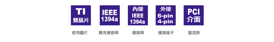 提供外接2個6-pin和1個4-pin IEEE 1394a連接埠 提供內接1個6-pin連接埠 |